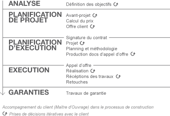 Le processus de construction type comprend toutes les opérations entre la première prise de contact et la fin de la période de garantie. Le Maître d'Ouvrage ou son représentant sont amenés à prendre des décisions selon un échéancier fixé conjointement avec COGAR en début de projet, et par des interactions itératives avec la Direction du Projet à chaque jalon. COGAR est mandaté ou contracté pour une partie ou pour la totalité de ce processus, en collaboration avec nos bureaux partenaires: architectes, ingénieurs et spécialistes.
